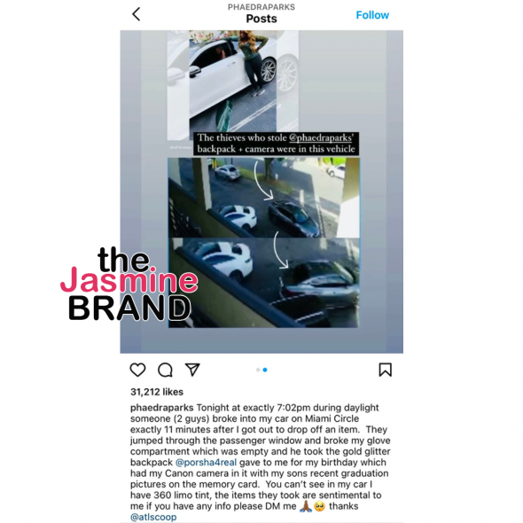 “They jumped through the passenger window and broke my glove compartment, which was empty, and he took the gold glitter backpack @porsha4real gave to me for my birthday, which had my Canon camera in it with my sons recent graduation pictures on the memory card.”
