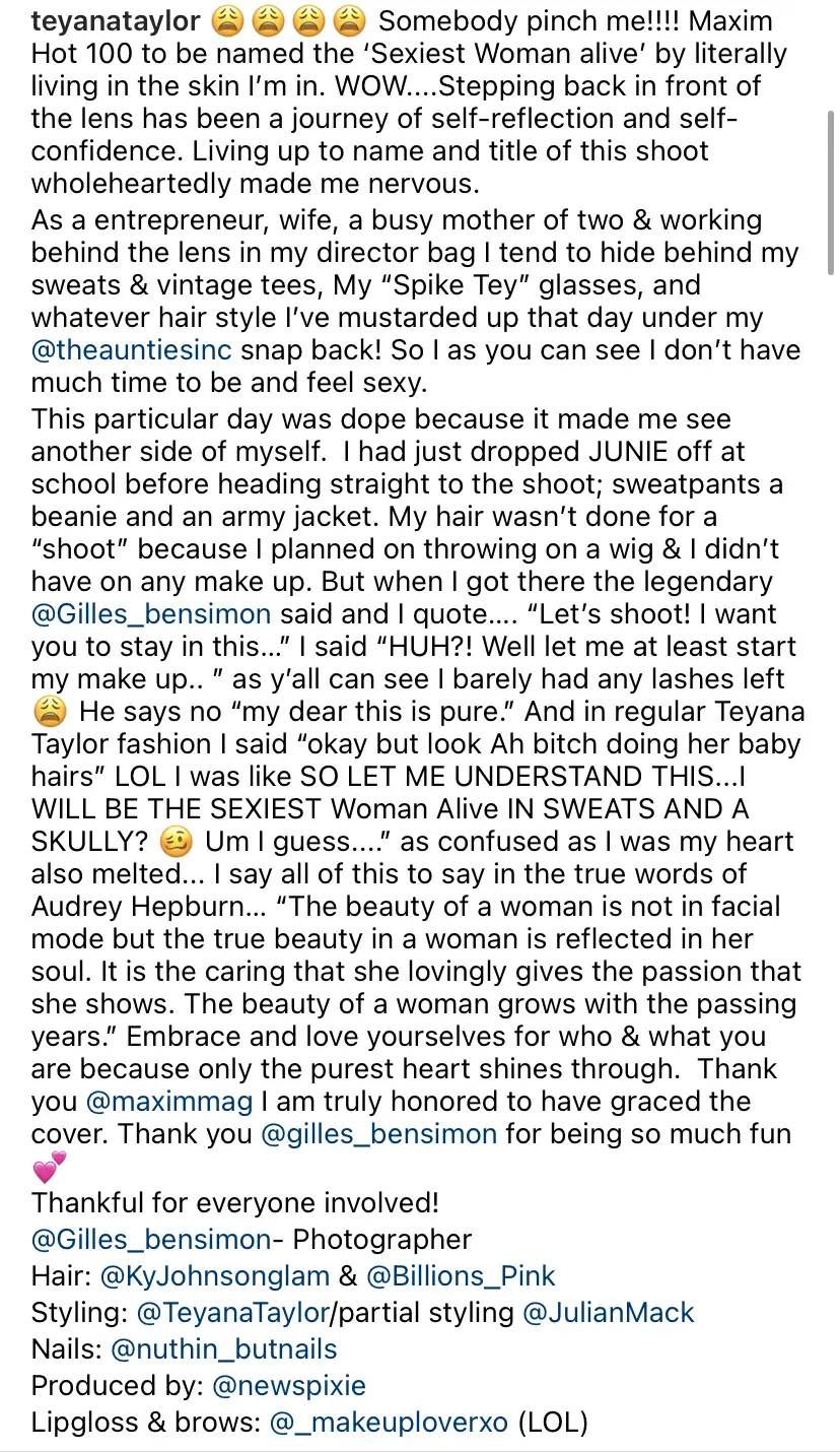 This particular day was dope because it made me see another side of myself. I had just dropped JUNIE off at school before heading straight to the shoot; sweatpants a beanie and an army jacket. My hair wasn’t done for a “shoot” because I planned on throwing on a wig & I didn’t have on any make up. But when I got there the legendary @Gilles_bensimon said and I quote…. “Let’s shoot! I want you to stay in this…” I said “HUH?! Well let me at least start my make up.. ” as y’all can see I barely had any lashes left He says no “my dear this is pure.” And in regular Teyana Taylor fashion I said “okay but look Ah bitch doing her baby hairs” LOL I was like SO LET ME UNDERSTAND THIS…I WILL BE THE SEXIEST Woman Alive IN SWEATS AND A SKULLY? ? Um I guess….” as confused as I was my heart also melted…