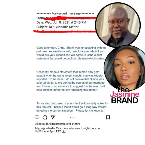 The public fallout between Falynn Guobadia and her ex Simon Guobadia, who is currently engaged to Porsha Williams, continues. Today (June 10th), Falynn posted what appears to be an alleged message sent to her rep, from Simon’s rep saying that’s she should release a statement denying that she thinks he was unfaithful during their marriage.
