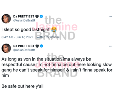 “As long as von in the situation ima always be respectful cause I’m not finna be out here looking slow gang he can’t speak for himself & I ain’t finna speak for himBe safe out here y’all”