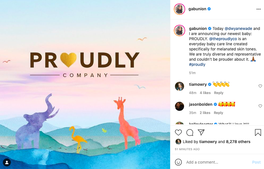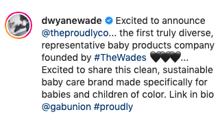 “Excited to announce @theproudlyco… the first truly diverse, representative baby products company founded by #TheWades … Excited to share this clean, sustainable baby care brand made specifically for babies and children of color. Link in bio @gabunion#proudly“
