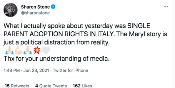 “What I actually spoke about yesterday was SINGLE PARENT ADOPTION RIGHTS IN ITALY. The Meryl story is just a political distraction from reality. Thx for your understanding of media.”