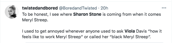 Sharon Stone trends on Twitter after sharing her thoughts on fellow actresses Viola Davis and Meryl Streep. Sharon Stone, 63, is a current topic of discussion after she said that Viola Davis, 55, ‘is every bit the actress’ as Meryl Streep, 72. During a recent interview, Sharon Stone was seemingly offended when she was asked about finally getting to work with Meryl Streep on Steven Soderbergh’s 2019 Netflix film The Laundromat. Sharon Stone responded and said,