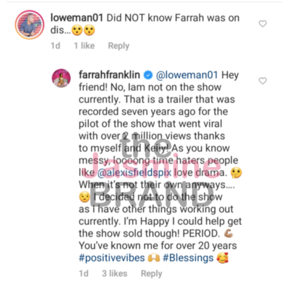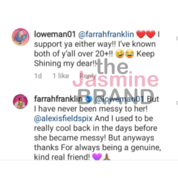 A fan mistakenly thought the footage was from producer Carlos King’s current show Bet Presents The Encore and commented they didn’t know that Farrah was on the show. Farrah responded to the fan and explained that she isn’t and the video is old. She also took multiple shots at Alexis and wrote,