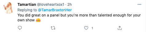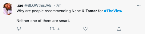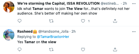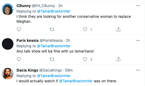 Shortly after, Tamar Braxton replied to a fan who said Meghan McCain’s replacement should be a person of color and tagged Tamar Braxton.