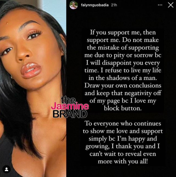 “If you support me, then support me. Do not make the mistake of supporting me due to pity or sorrow bc I will disappoint you every time. I refuse to live my life in the shadows of a man. Draw your own conclusions and keep that negativity off of my page bc I love my block button.”