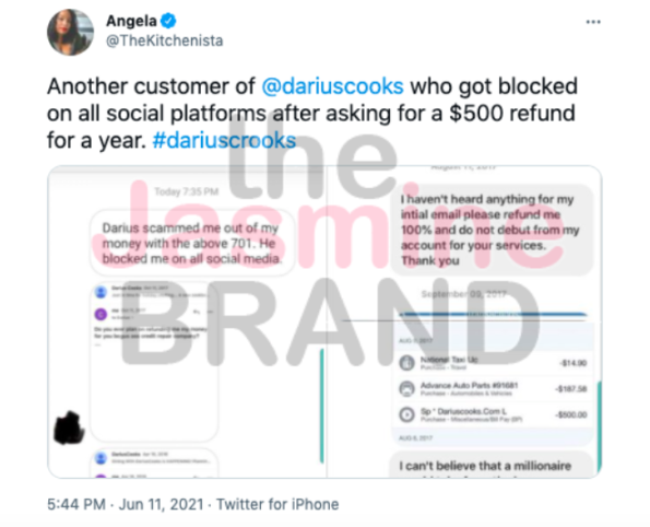 Angela “The Kitchenista” Davis is just one of Darius Williams’ fellow celebrity chefs that have called him out online. She shared stories from a social media user who said Darius Williams took $500 from her account for a credit repair service and went MIA when she asked for a refund.