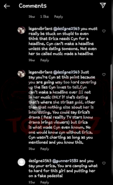 “you must really be stuck on stupid to even think that Erica needs Cyn for a headline. Cyn can’t make a headline unless she dating someone. Not even her so called music made a headline.”