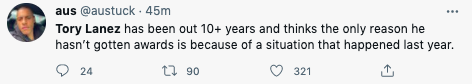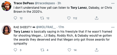 While Tory Lanez has maintained his innocence, he can’t publicly speak on the incident because he’s currently facing charges for it. Still, it looks like he’s claiming that she won the award because she allegedly framed him.