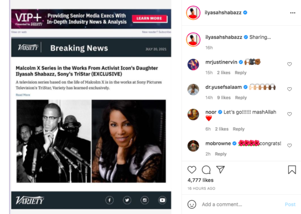 Ilyasah Shabazz shared the news of her current project via her Instagram account. She captioned the post,