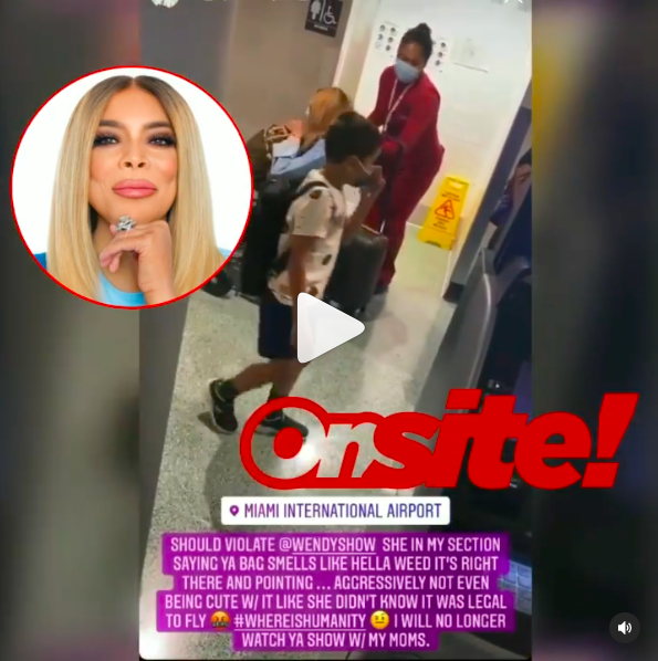 In the next part of the video, the men and Wendy Williams appear to be back on the ground as he records the media personality being wheeled out of the restroom in a wheelchair. The text on the screen goes into more detail about the alleged situation and claims that Wendy pointed at his bag ‘aggressively’ and claimed it was the source of the marijuana smell.