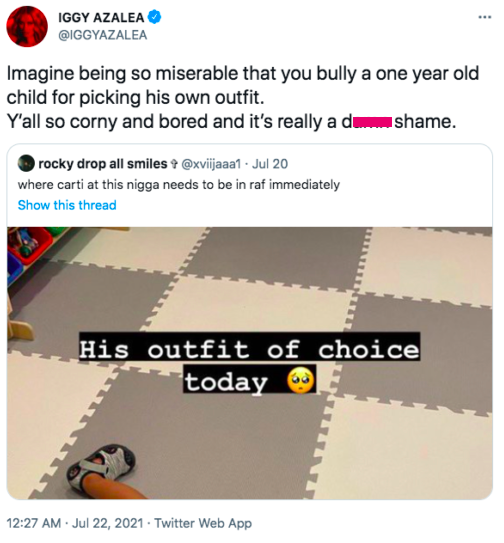 “Imagine being so miserable that you bully a one-year-old child for picking his own outfit. Y’all so corny and bored and it’s really a d*** shame.”