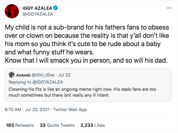 “My child is not a sub-brand for his father’s fans to obsess over or clown on because the reality is that y’all don’t like his mom so you think it’s cute to be rude about a baby and what funny stuff he wears. Know that I will smack you in person, and so will his dad.”