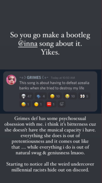 Azealia Banks appeared to respond to Grimes’ claims against her in a no-longer-available IG stories post and wrote that Grimes