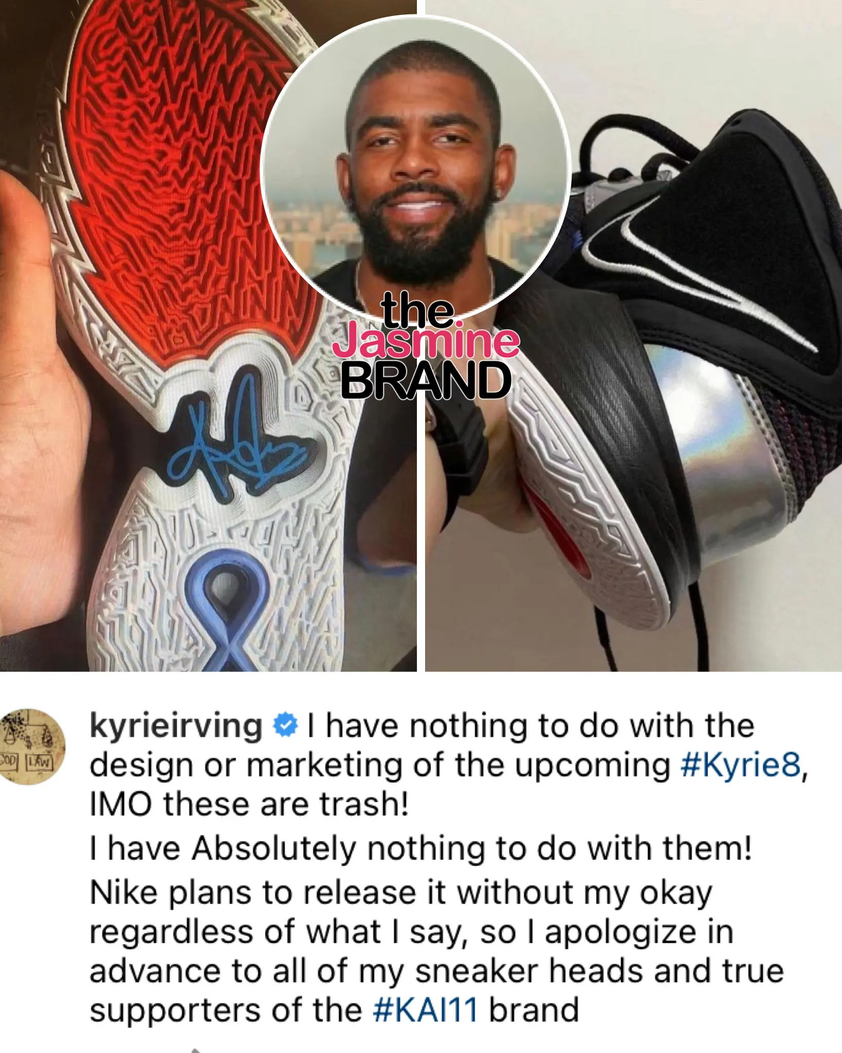 “I have nothing to do with the design or marketing of the upcoming Kyrie 8 IMO these are trash! I have absolutely nothing to do with them! Nike plans to release it without my okay regardless of what I say, so I apologize in advance to all of my sneaker heads and true supporters of the #KAI11 brand.”