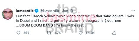 The video is said to be the first in history to reach 1 billion views with an inexpensive budget. Cardi B tweeted earlier this year that it cost $15,000 to make.