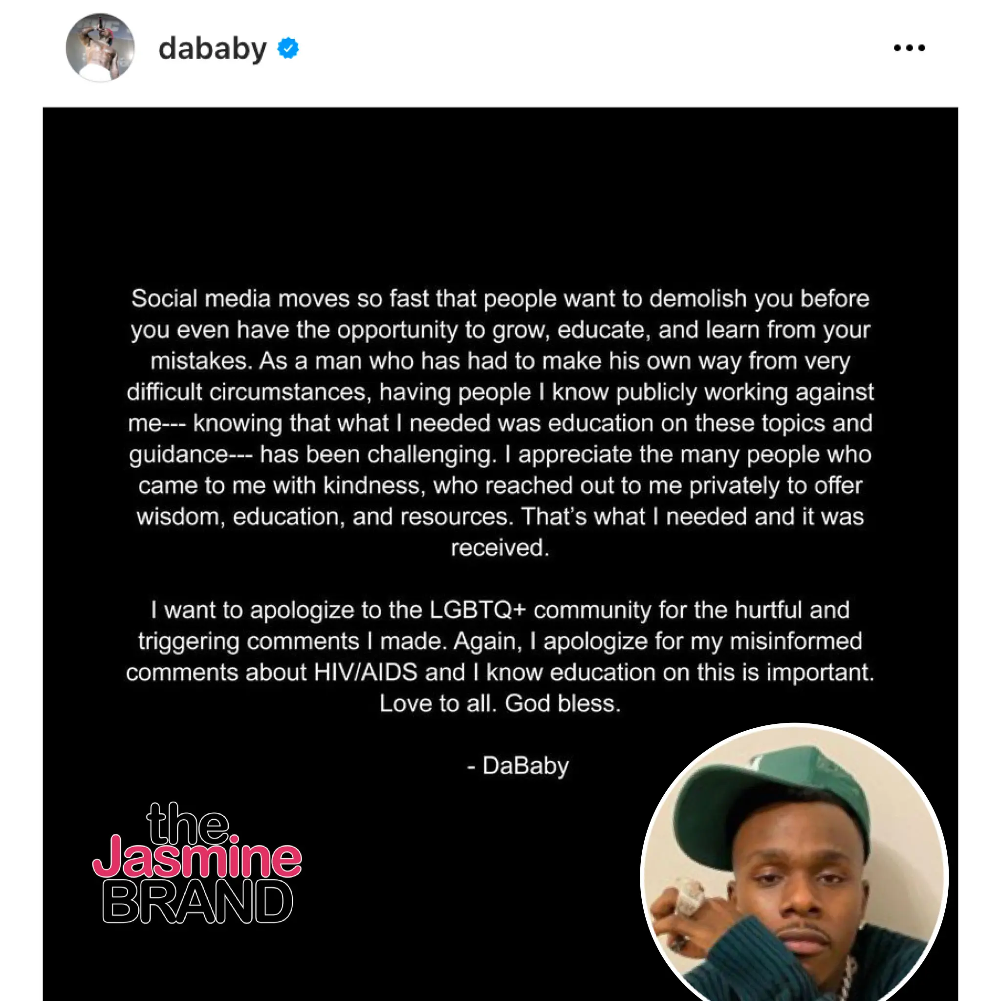 “I want to apologize to the LGBTQ+ community for the hurtful and triggering comments I made. Again, I apologize for my misinformed comments about HIV/AIDS and I knew education on this is important. Love to all. God bless. – DaBaby”
