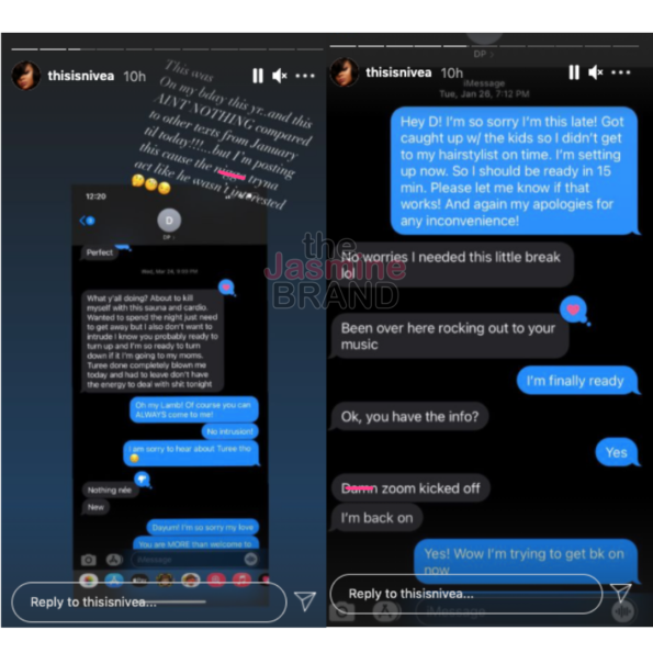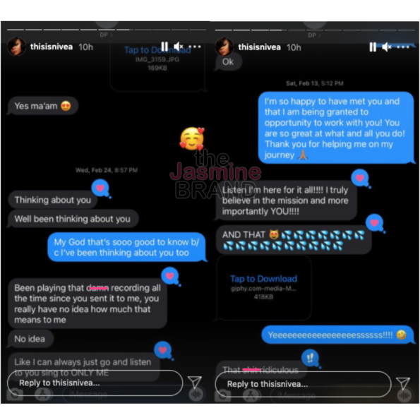 Patterson’s response seemingly prompted Nivea to fire off a series of receipts via her IG stories. In the uploads, she shared screenshots of alleged conversations she once had with Patterson, that indicated their relationship wasn’t one-sided like he claimed it was. In one of the text messages, Patterson’s shared his gratitude towards Nivea for sending him a personal recording of herself singing.