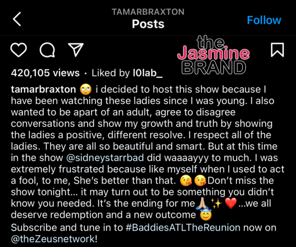 The Baddies of ATL: The Reunion premiered this Sunday on Zeus Network and the drama wasn’t only between the castmates. Singer and reality TV star, Tamar Braxton, who hosted the reunion with celebrity blogger and media personality Jason Lee, stormed off the set following her distaste for Sidney Starr’s actions. While leaving the stage, Tamar could be heard saying,