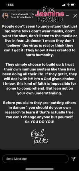 In a post on her Instagram story, the daughter of the late Muhammad Ali, shared her feelings about those choosing not receive the COVID-19 vaccine. In her post, Laila Ali said,