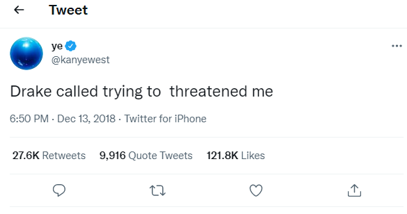 Throughout the years of their back and forth, the biggest fallout between the two rappers appears to be in 2018 when West claimed that Drake made threats toward him and his family.