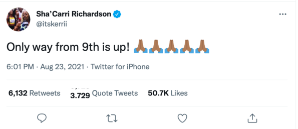 The Olympian is just one of the many people still rooting for Richardson’s success. After coming in 9th place for the Prefontaine Classic 100 meter race, many took to Twitter to give their opinions on it including Richardson herself. She stayed positive and tweeted,