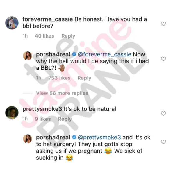 Following her post, a fan asked her to be real about if she had a Brazilian Butt Lift, also known as a BBL, or not. Porsha Williams responded saying,