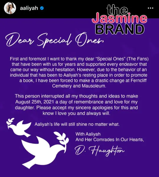 “This person interrupted all my thoughts and ideas to make August 25, 2021, a day of remembrance and love for my daughter. Please accept my sincere apologies for this and know I love you and always will. With Aaliyah and Her Comrades in out hearts.”