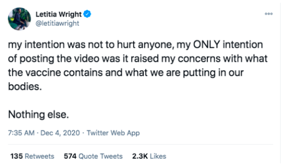 Following the backlash she received, Letitia Wright apologized and explained why she shared the video. She tweeted,