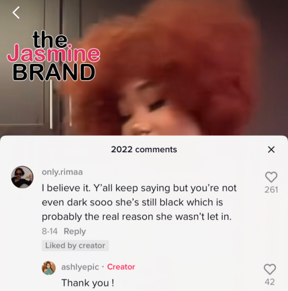 Some Tik Tok commentators don’t believe the Tik Tok creator, Ashley, is telling the truth because they don’t think she’s dark skin or because they think she’s lying for clout. But there are some users that do believe her and she thanked them for supporting her.