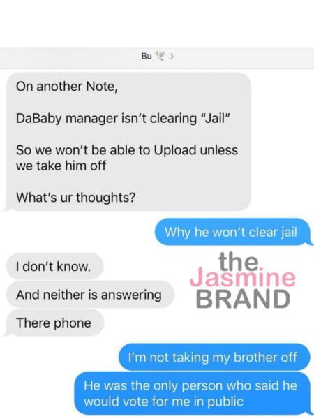 The screenshots included brief messages between Kanye West and his manager, Bu Thiam. West then reached out to what appeared to be DaBaby, which he included in his Instagram post.