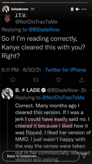 Although the allegation hasn’t been confirmed or acknowledged publicly by Kanye West or his team, B.Slade commented via Twitter and called out Bri Babineaux for not getting his green light before recording his song, Make Me Over.