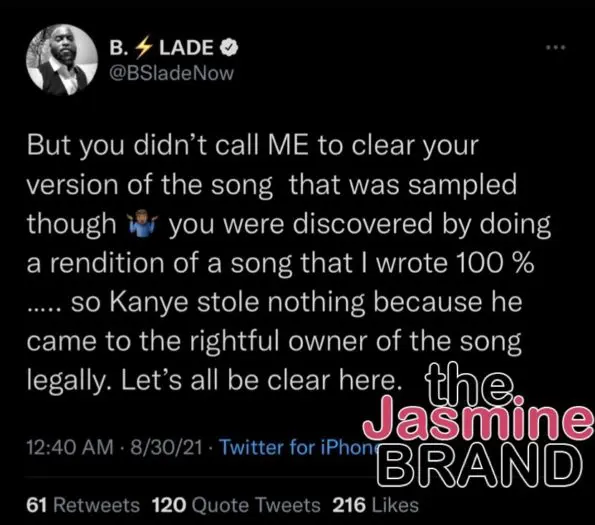 “But you didn’t call ME to clear your version of the song that was sampled though [shrug Emoji] you were discovered by doing a rendition of a song that I wrote 100%…..so Kanye stole nothing because he came to the rightful owner of the song legally. Let’s all be clear here.”