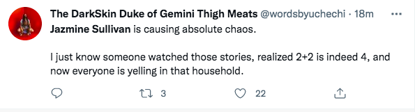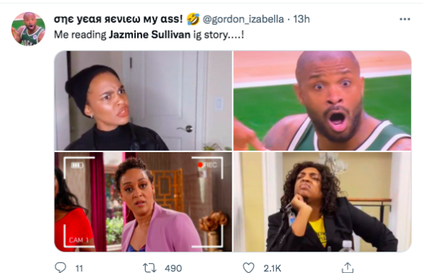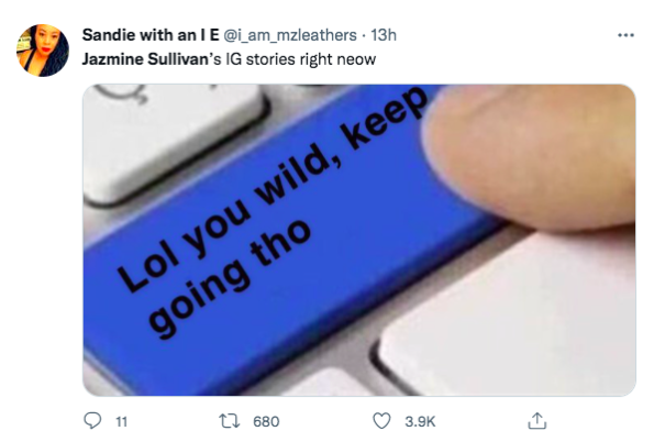 Jazmine Sullivan’s IG story is such a mess I’m dying ???? Her meme & music selection too perfect ??? pic.twitter.com/t0lzIo1Vbo