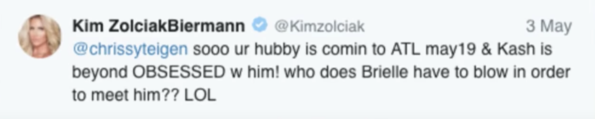 “@chrissyteigen sooo ur hubby is comin to ATL may19 & Kash is beyond OBSESSED w him! who does Brielle have to blow in order to meet him?? LOL”