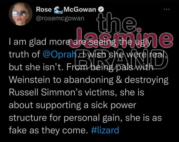 “I am glad more are seeing the ugly truth of @Oprah. I wish she were real, but she isn’t. From being pals with Weinstein to abandoning & destroying Russell Simmon’s victims, she is about supporting a sick power structure for personal gain, she is as fake as they come. #lizard.”