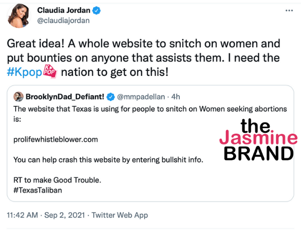 Claudia Jordan also reposted a tweet that shows a website where people can submit women’s names who are seeking abortions called Profilewhistleblower.com. According to one Twitter user, you can crash the site by entering false information.