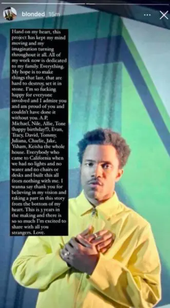 In an Instagram story post to fans and collaborators, Ocean detailed the goal of Homer and creating pieces that will stand the test of time. In his post he said,