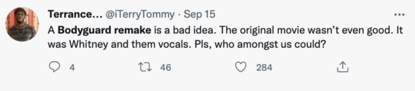 Bodyguard remake .. who thought that was a good idea … pic.twitter.com/lAnOonNLyQ