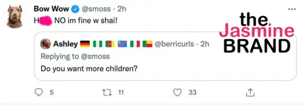 In a couple of tweets, the rapper and actor replied to questions from fans about more children and his alleged son. Responding to a question about if he wanted more kids, Bow Wow said,