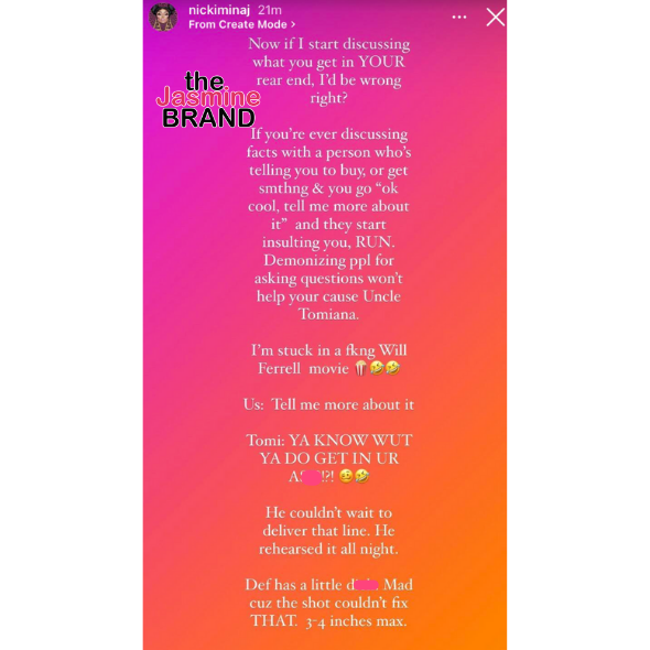Nicki Minaj caught wind of his comments and fired back on Instagram. She wrote,