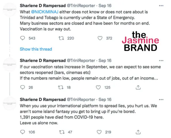 In a now-deleted tweet, Nicki continued to call out reporter Sharlene Rampersad, who also responded to Nicki Minaj on Twitter – however shortly after Rampersad deleted the tweets and her account.