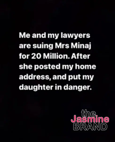“Me and my lawyers are suing Mrs. Minaj for 20 million. After she posted my address and put my daughter in danger.”