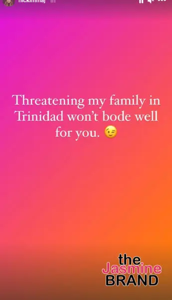 The rapper then claimed that a reporter in Trinidad was harassing her family and trying to contact them. In a series of Instagram stories, Nicki alleges the reporter contacted her but the conversation did not seem to go well. She posted the conversation along with the reporter’s information.
