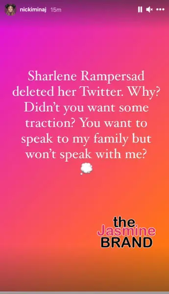 As the back and forth between the reporter and Minaj has continued, on today, Sept. 21st, 2021, an Instagram account appearing to belong to Sharlene Rampersad, accused the rapper of leaking her personal information and announced a $20 million lawsuit. On her Instagram story, she wrote,