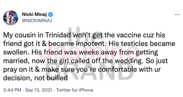 “My cousin in Trinidad won’t get the vaccine cuz his friend got it & became impotent. His testicles became swollen. His friend was weeks away from getting married, now the girl called off the wedding. So just pray on it & make sure you’re comfortable with ur decision, not bullied”
