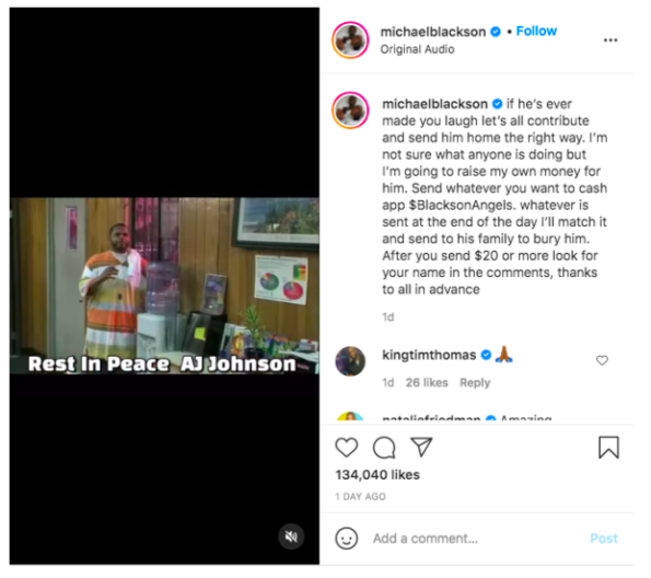 Following her interview, Comedian Michael Blackson shared a post to his own IG page encouraging his fans to donate to the Johnson family and vowed to match donations.