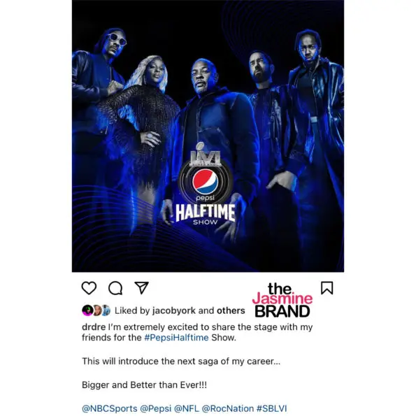 “The opportunity to perform at the Super Bowl Halftime show, and to do it in my own backyard, will be one of the biggest thrills of my career,” Dre said in a statement. “I’m grateful to JAY-Z, Roc Nation, the NFL and Pepsi as well as Snoop Dogg, Eminem, Mary J. Blige and Kendrick Lamar for joining me in what will be an unforgettable cultural moment.”