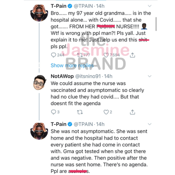 A fan replied to T-Pain’s initial Tweet and suggested that the nurse was probably vaccinated and asymptomatic, but T-Pain denied the speculation.