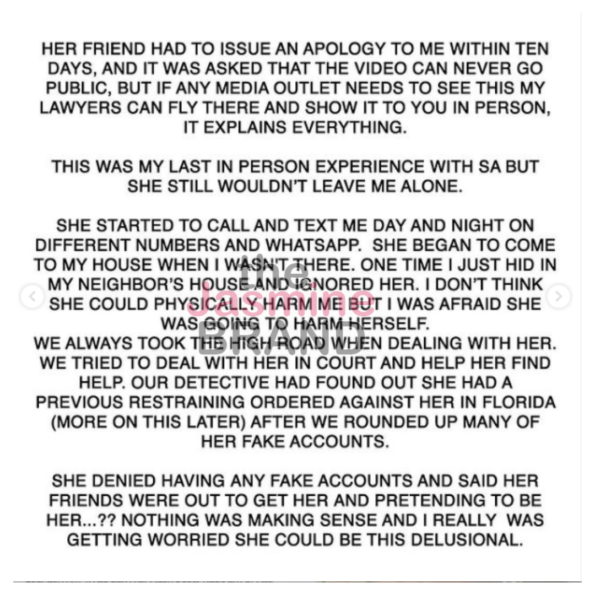 “I will keep this story easy to read because I know the internet has a short attention span, and it was my goal to never address a stalker. I will refer to her as ‘SA’ (and you can find anything easily online) she was an obsessed fan of mine, and after I relinquished all contact with her, it appears that her only purpose in life has been to disrupt my work, my business, harass me and my close friends and attack me and threaten my family. To be clear, SA was not a minor when I had conversations or sexual intercourse with her. Her own text messages admit this.”